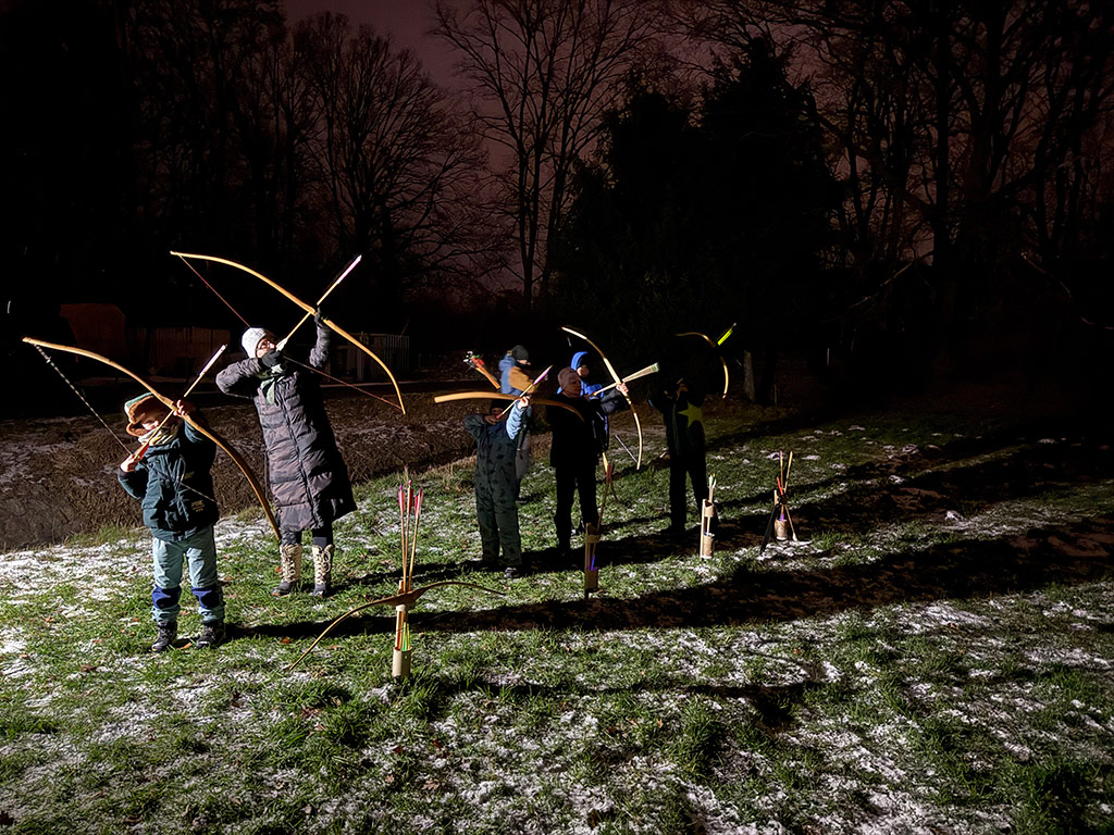 Der Abend des 3.1.2026 stand bei uns unter dem Motto Lagerfeuer und Knicklichtschießen. An unsere Holzpfeile wurden Knicklichter befestigt und die Pfeile dann in den Nachthimmel geschossen. Tatsächlich haben wir alle Pfeile wieder gefunden. Besonders für die Kinder war das ein besonderes Erlebnis. Eric und Julius hatten ihre Pfeile mit Leuchtnocken bestückt, was noch ein extra Erlebnis wurde.